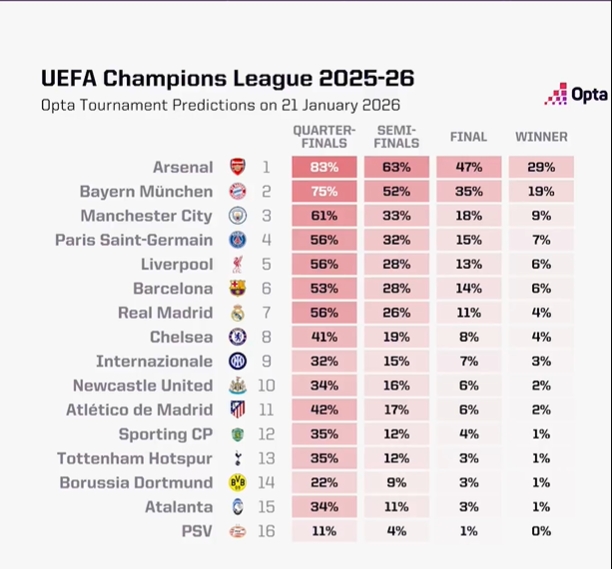 1月21日讯 本赛季欧冠已经进行7轮,OPTA统计各队夺冠概率,阿森纳29%的概率位列第一,拜仁第二、曼城第三。附OPTA欧冠夺冠概率:1 阿森纳29%2 拜仁19%3 曼城9%4 巴黎圣日耳曼7%5 利物浦6%6 巴萨6%7 皇马4%8 切尔西4%9 国米3%10 纽卡2%11 马竞2%12 葡体1%13 热刺1%14 多特1%15 亚特兰大1%16 埃因...