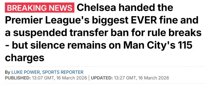 开云体育-1075万!邮报:切尔西罚单金额创纪录 但曼城115项指控案仍无结果