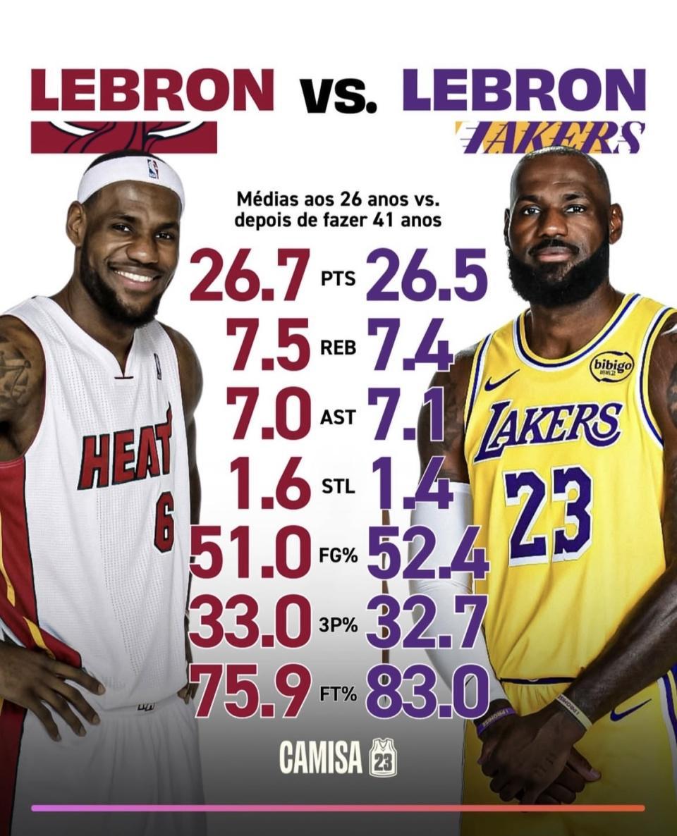 26岁时,詹姆斯场均26.7分、7.5个篮板、7.0次助攻、1.6次抢断,投篮命中率51.0%,三分命中率33.0%,罚球命中率75.9%。满41岁之后,场均26.5分、7.4个篮板、7.1次助攻、1.4次抢断,投篮命中率52.4%,三分命中率32.7%,罚球命中率83.0%。